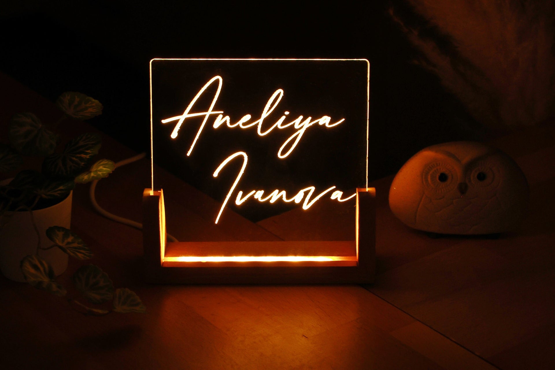 Wir präsentieren unser atemberaubendes quadratisches Namensschild und unser personalisiertes Plexiglas-Nachtlicht, eine Kombination aus Eleganz und Funktionalität. Dieses exquisite Stück dient sowohl als funktionales Schreibtischschild als auch als bezauberndes Nachtlicht.