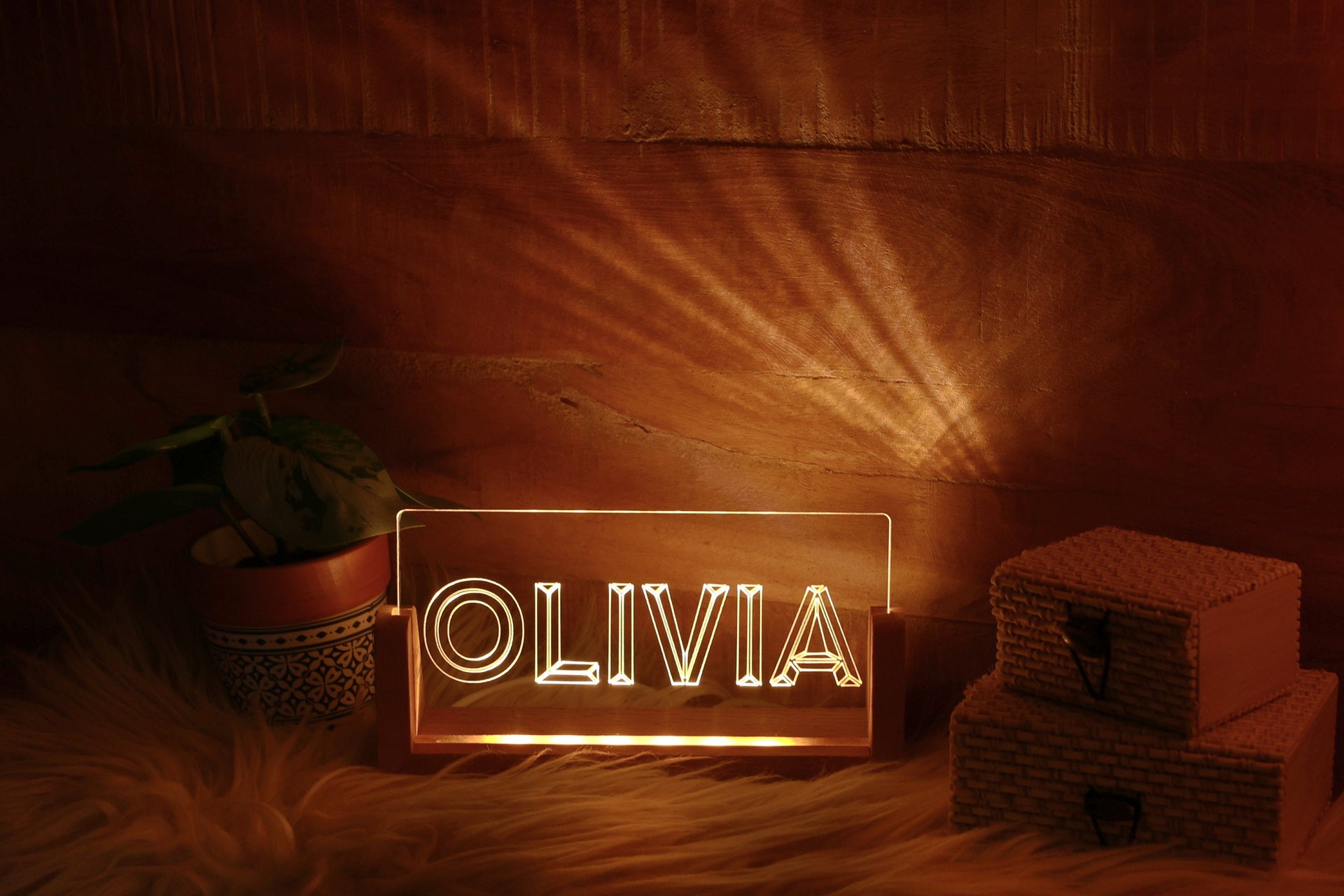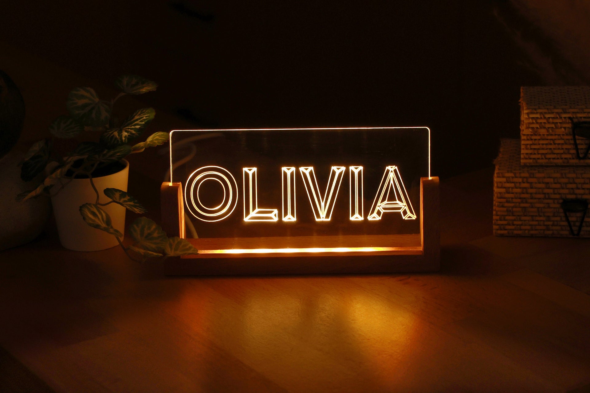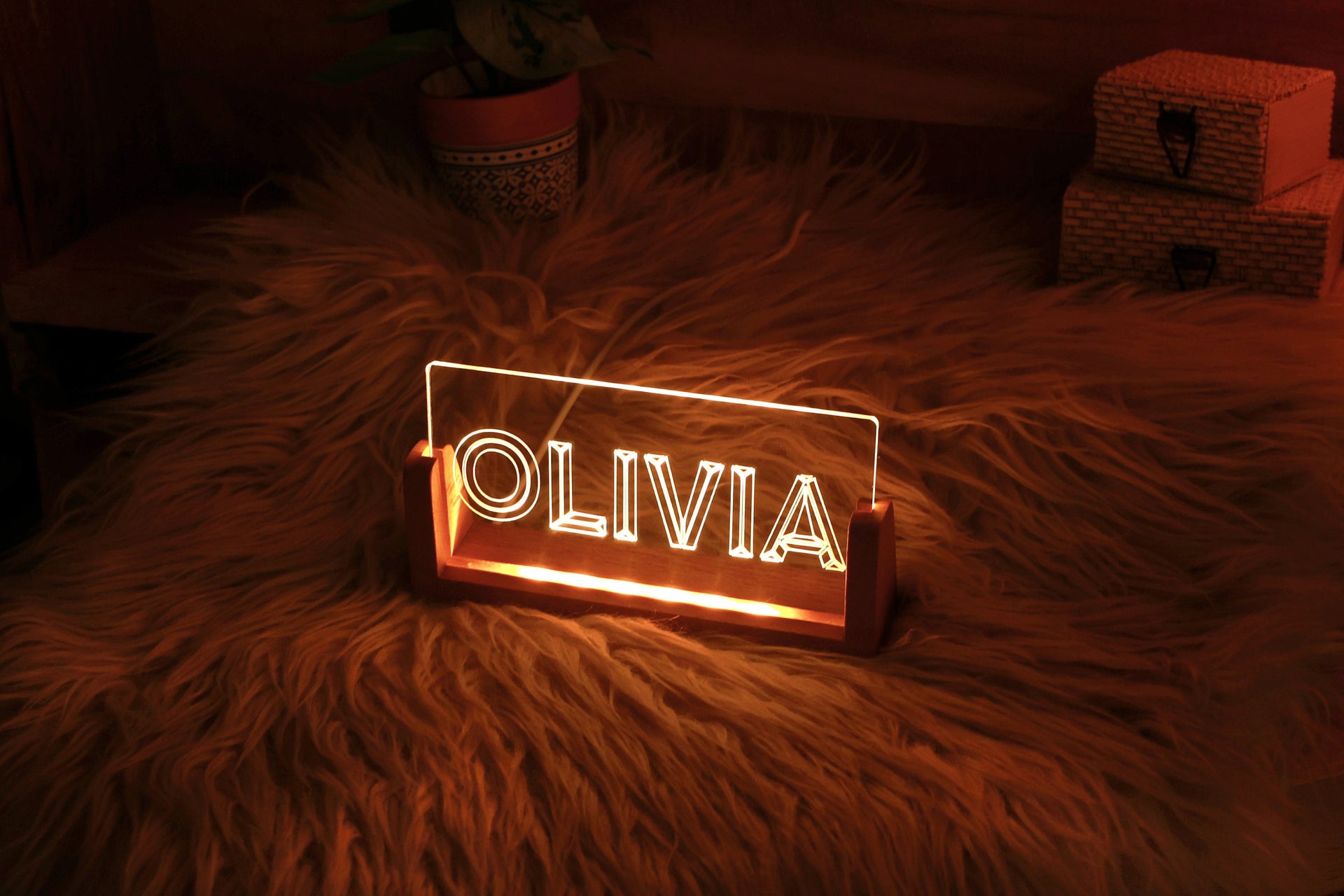 Verleihen Sie Ihrem Zimmer mit diesem wunderschönen, individuellen Nachtlicht aus Plexiglas und Holz Farbe.