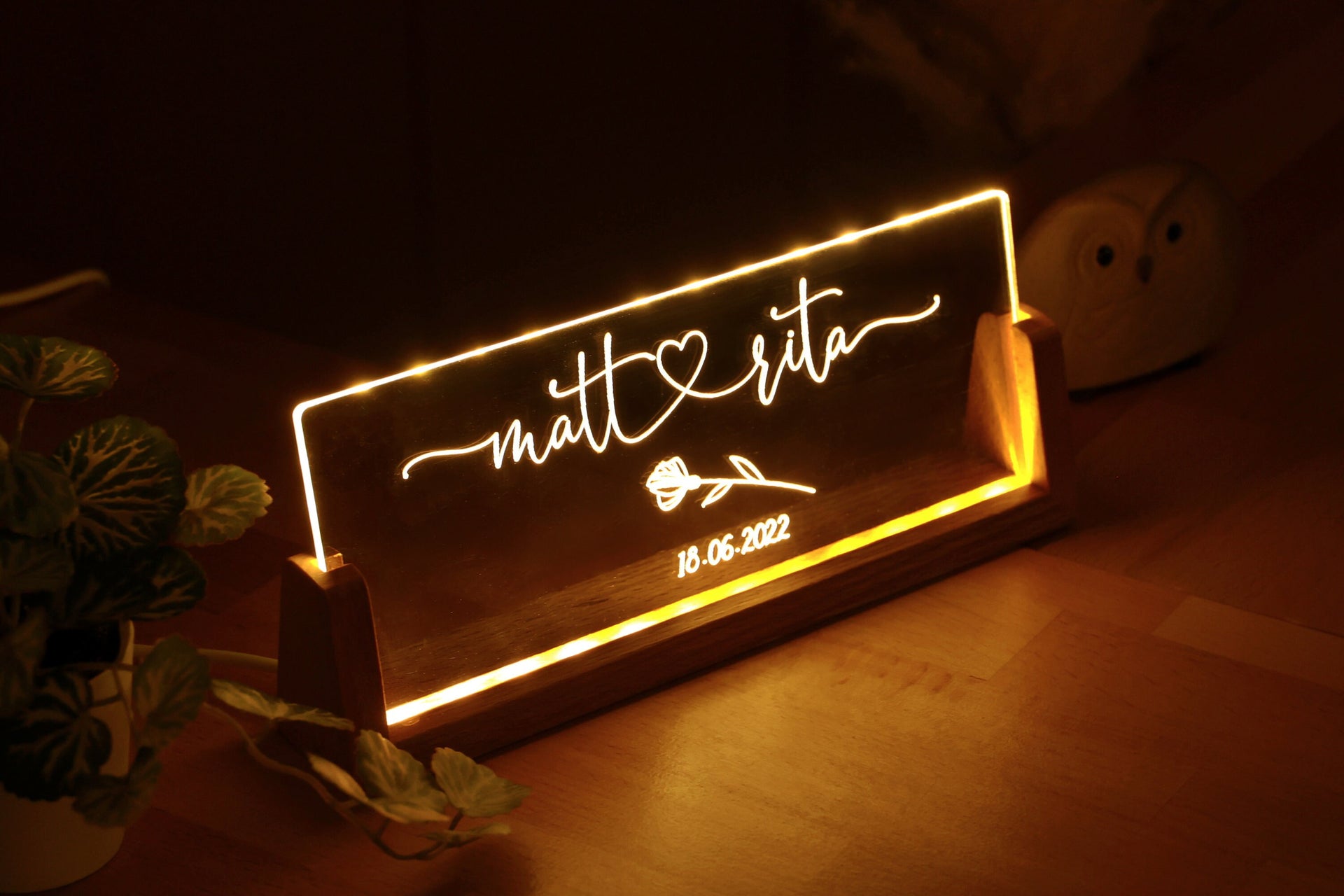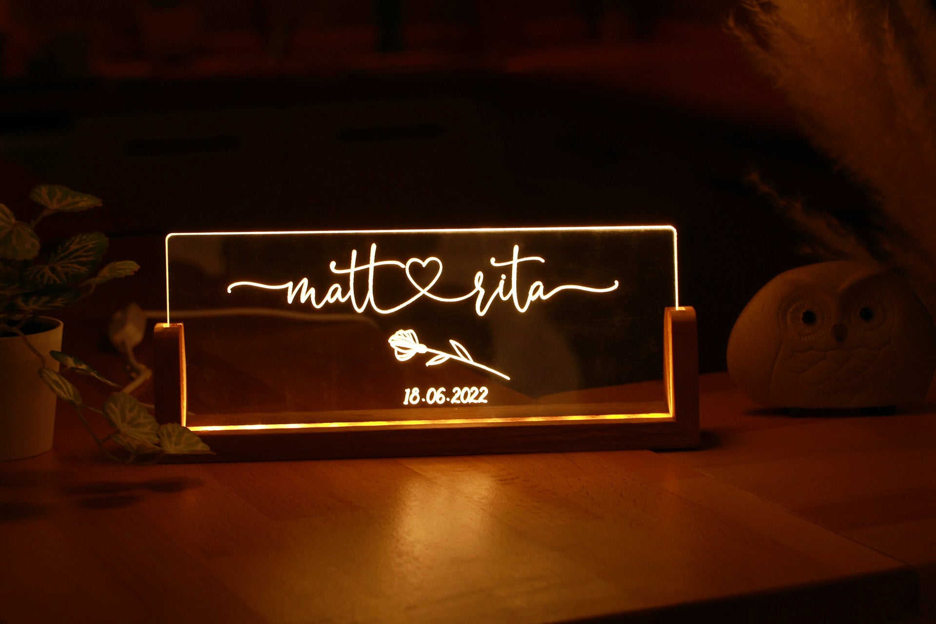 Erhellen Sie Ihre Liebesgeschichte mit unserem personalisierten Plexiglas-Nachtlicht für Paare. Egal, ob Sie ein unverheiratetes Paar, frisch verheiratet oder seit langem verheiratet sind, dieses Nachtlicht ist dazu gedacht, Ihre einzigartige Verbindung zu feiern. Es ist die ideale Geschenkidee für jeden Jahrestag, auch Ihren ersten, und es stellt Ihre Reise als Paar auf wunderschöne Weise dar.